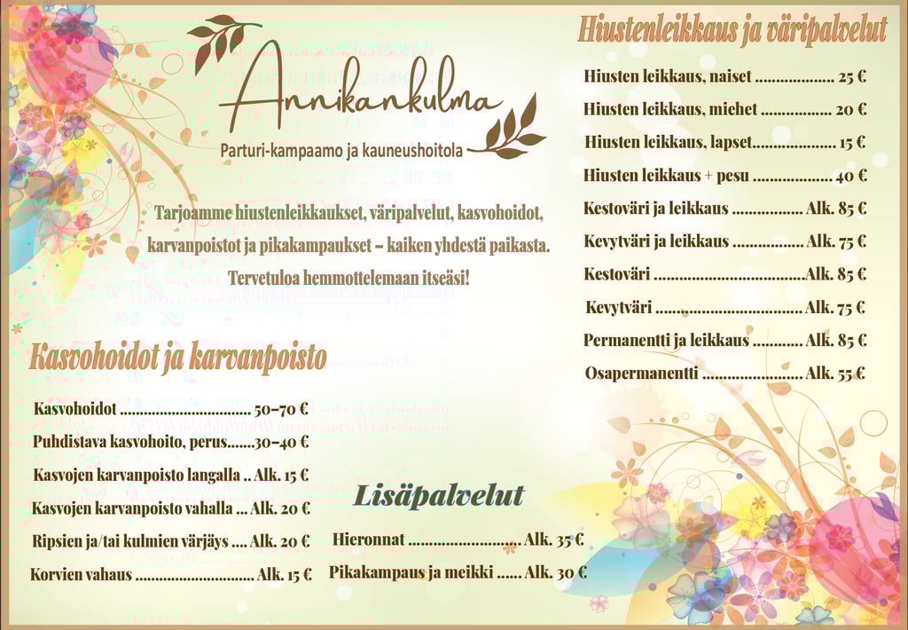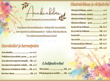 Me AnnikaNkulma tarjoamme monipuolisia kauneuspalveluja, kuten hiustenleikkauksia, väripalveluja ja kasvohoitoja. Tervetuloa hemmottelemaan itseäsi asiantuntevalla tiimillämme.